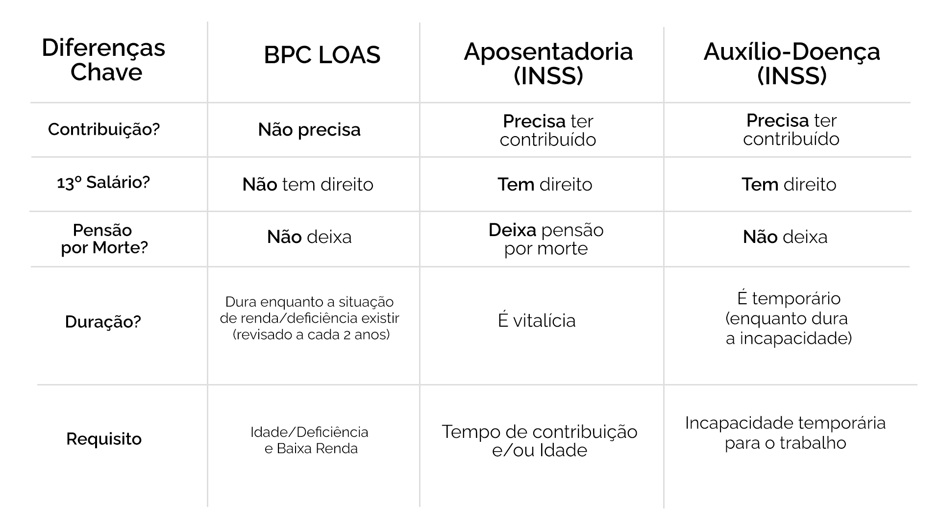 Não. Essa é a principal confusão. O BPC LOAS não é aposentadoria e nem auxílio-doença.
